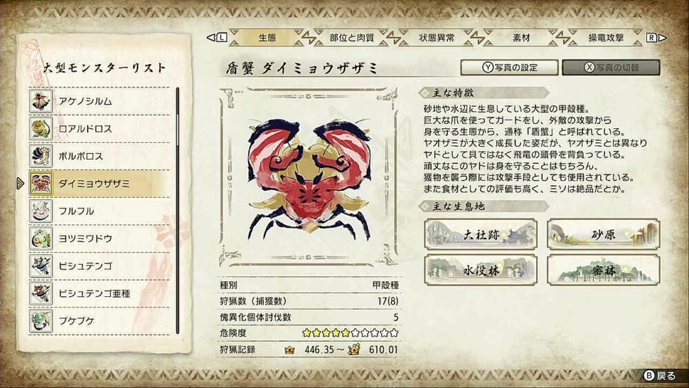 今回はサンブレイクで追加されたダイミョウザザミの最小金冠、最大金冠を取得しましたので、取得クエストや金冠ライン等を記録していこうと思います。