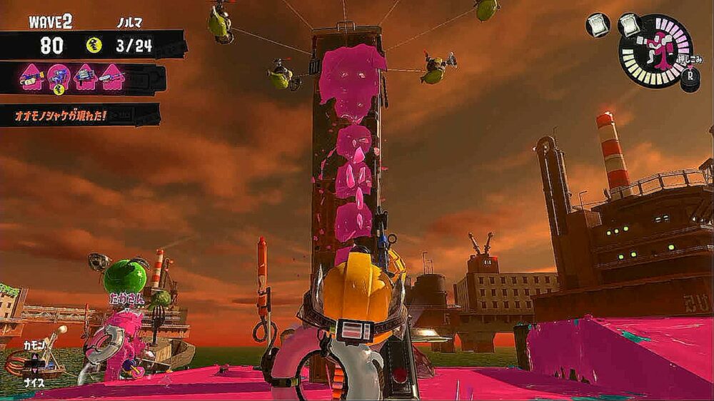 処理するにはフタの上にいるシャケを直接攻撃する必要がありますが、結構高い位置にいるため短射程武器では届かないので近づいて下に落とす必要があります。