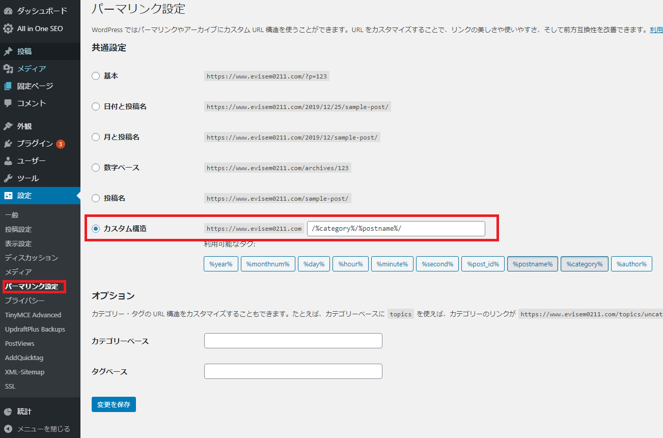 その後カスタム構造を選択し、/%category%/%postname%/と入力するか、それに対応するボタンを押下し、保存します。